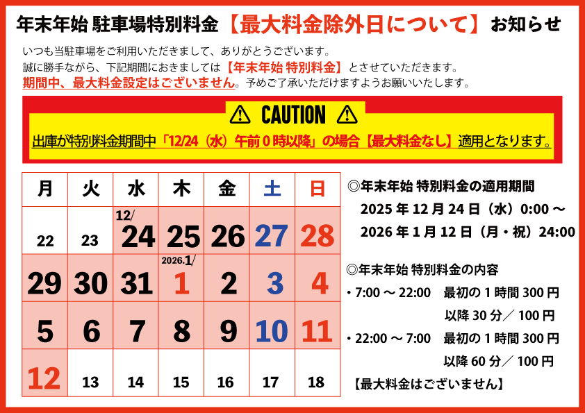 ※出庫が特別料金期間中【12月24日(水)午前0時以降】の場合は、年末年始特別料金(最大料金なし)適用されますので、