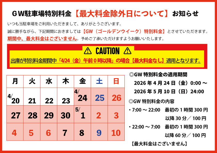 🅿️GW駐車場特別料金のお知らせ