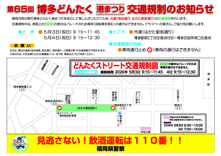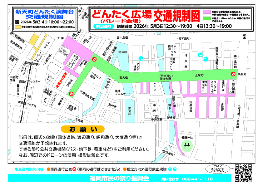 今年のGW期間【第65回博多どんたく(港まつり)】での交通規制に伴い【天神のりば(福岡市市役所)付近が封鎖されます】、よって下記期間の無料送迎バスは『運休』とさせて頂きます。
