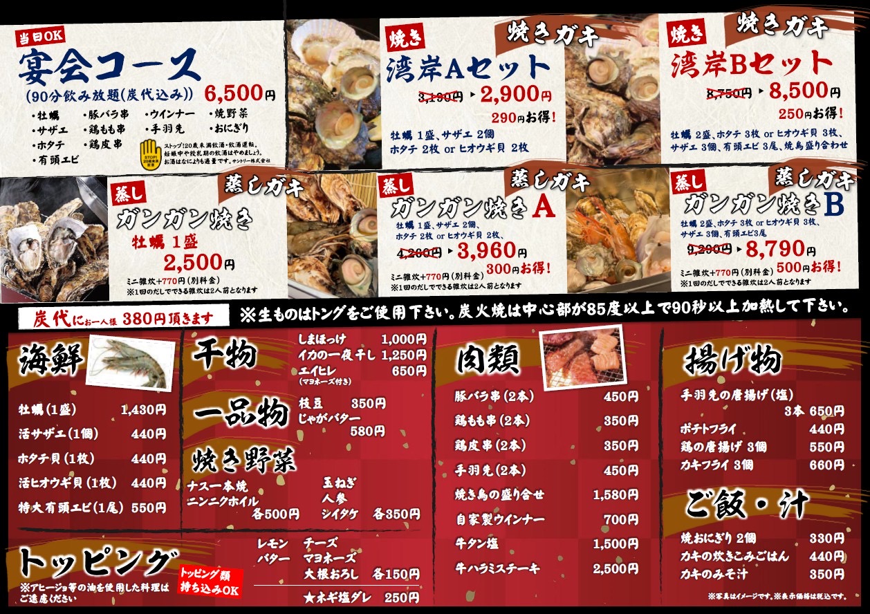 牡蠣を中心としたシーフードに串や野菜などがセットになった飲み放題付きの宴会コースもございますので、忘年会や宴会などにぜひご活用ください。
